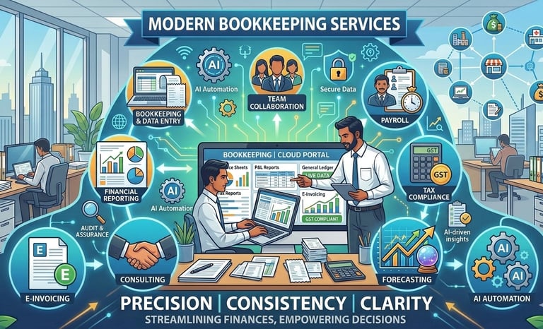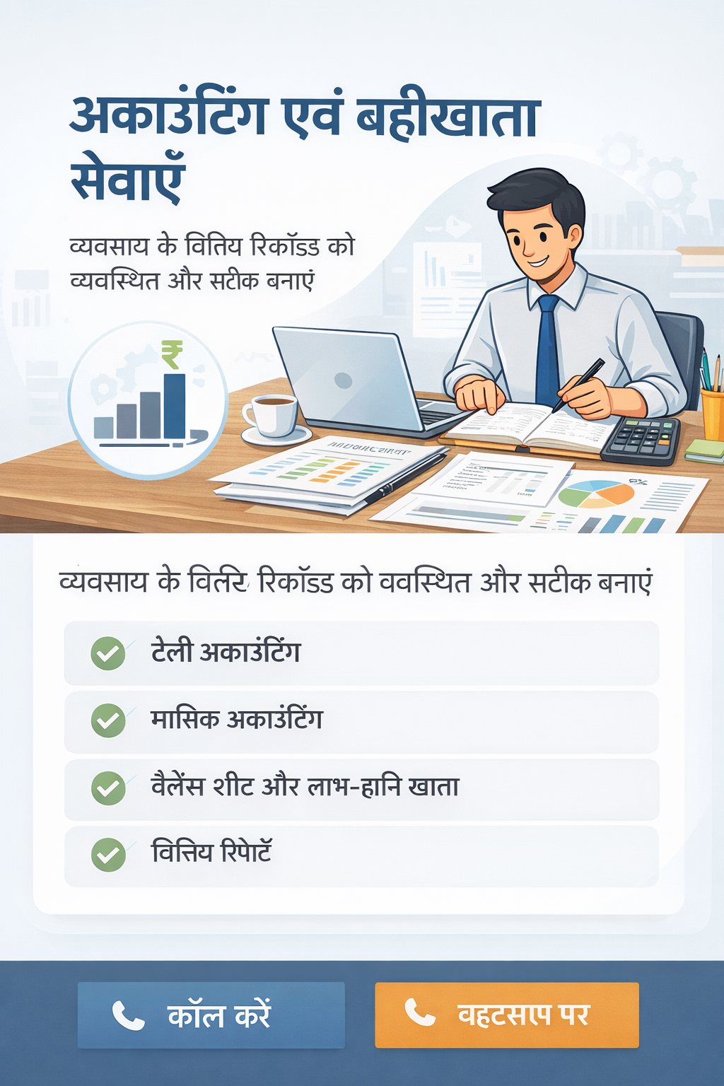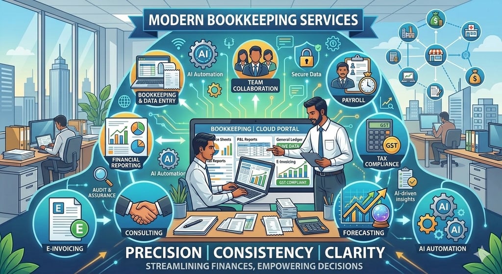 हमारे साथ पाएं भरोसेमंद Accounting और Bookkeeping सेवाएँ, ताकि आप अपने बिज़नेस पर ध्यान दें और हम संभालें आपके फाइनेंशियल रिकॉर्ड।