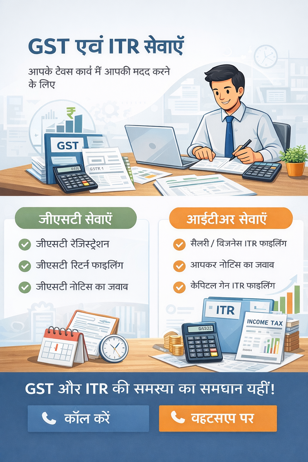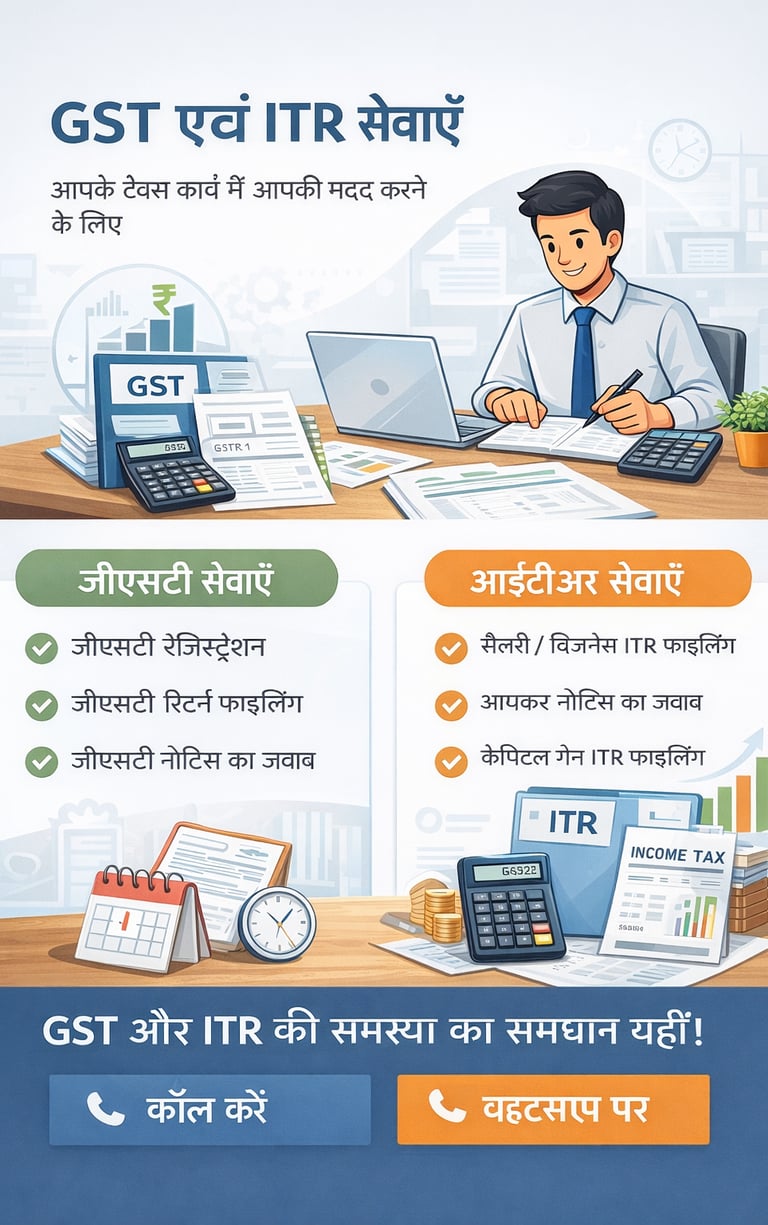 जीएसटी रिटर्न एवं आईटीआर भरने में मदद और मार्गदर्शन। हमारे साथ पाएं सही, समय पर और भरोसेमंद टैक्स सेवाएँ, ताकि आप बिना चिंता अपने बिज़नेस पर ध्यान दे सकें।