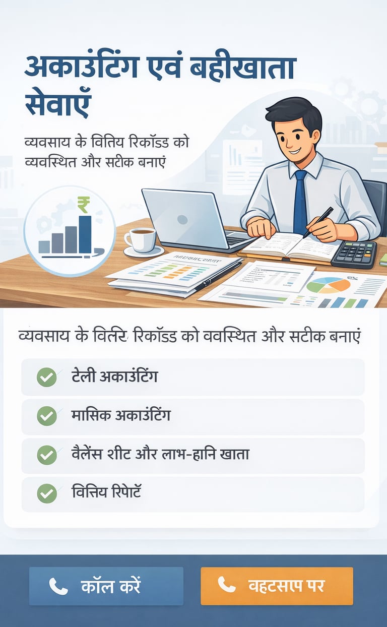 हम निम्नलिखित सेवाओं में विशेषज्ञता रखते हैं:✅ बुककीपिंग और अकाउंटिंग ✅ GST / ITR सेवाएँ ✅ बिज़नेस रजिस्ट्रेशन ✅ लीगल डॉक्यूमेंटेशन ✅ कम्प्लायंस सेवाएँ